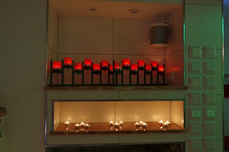mit vielen brennenden Kerzen/Teelichtern