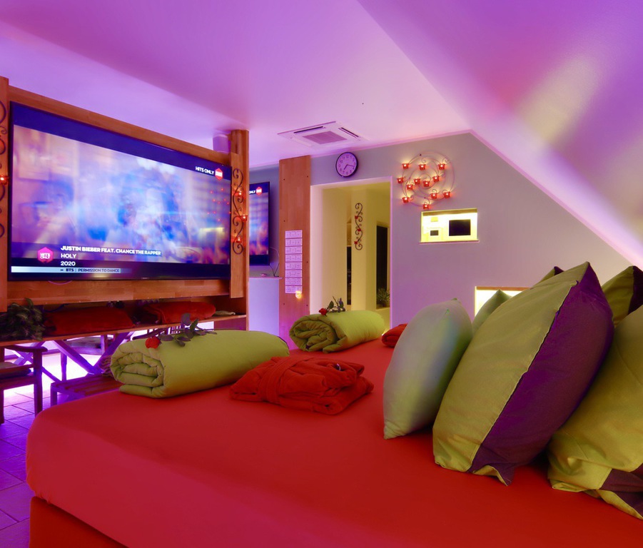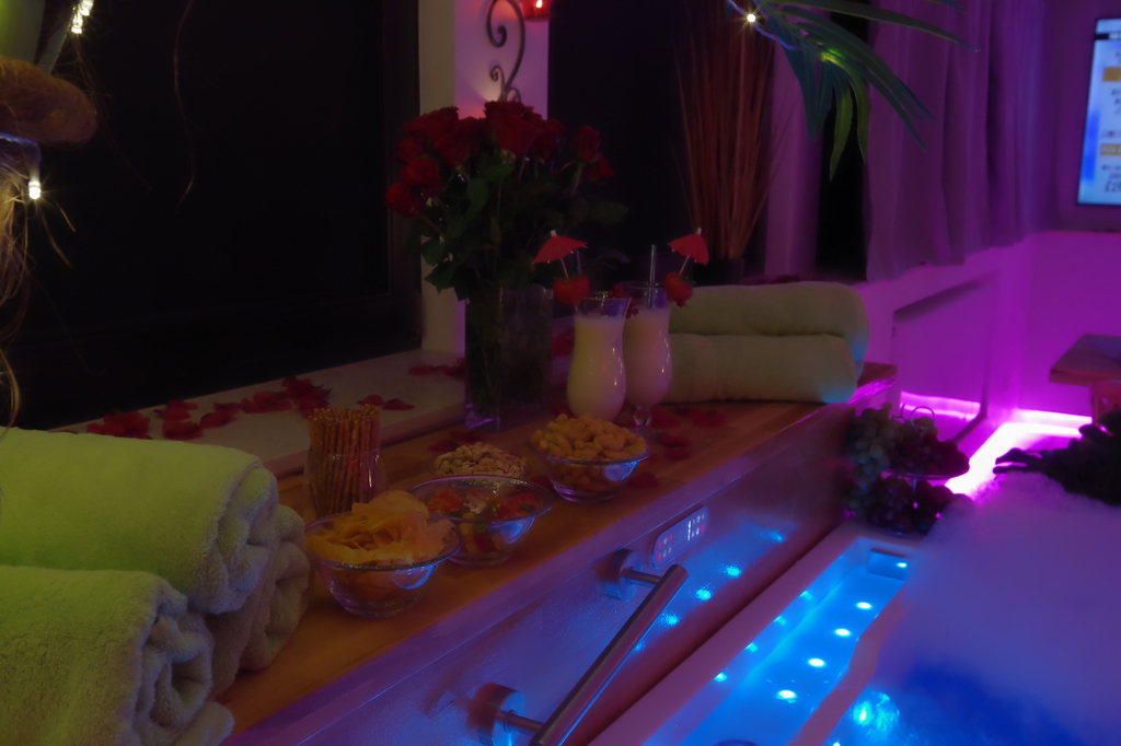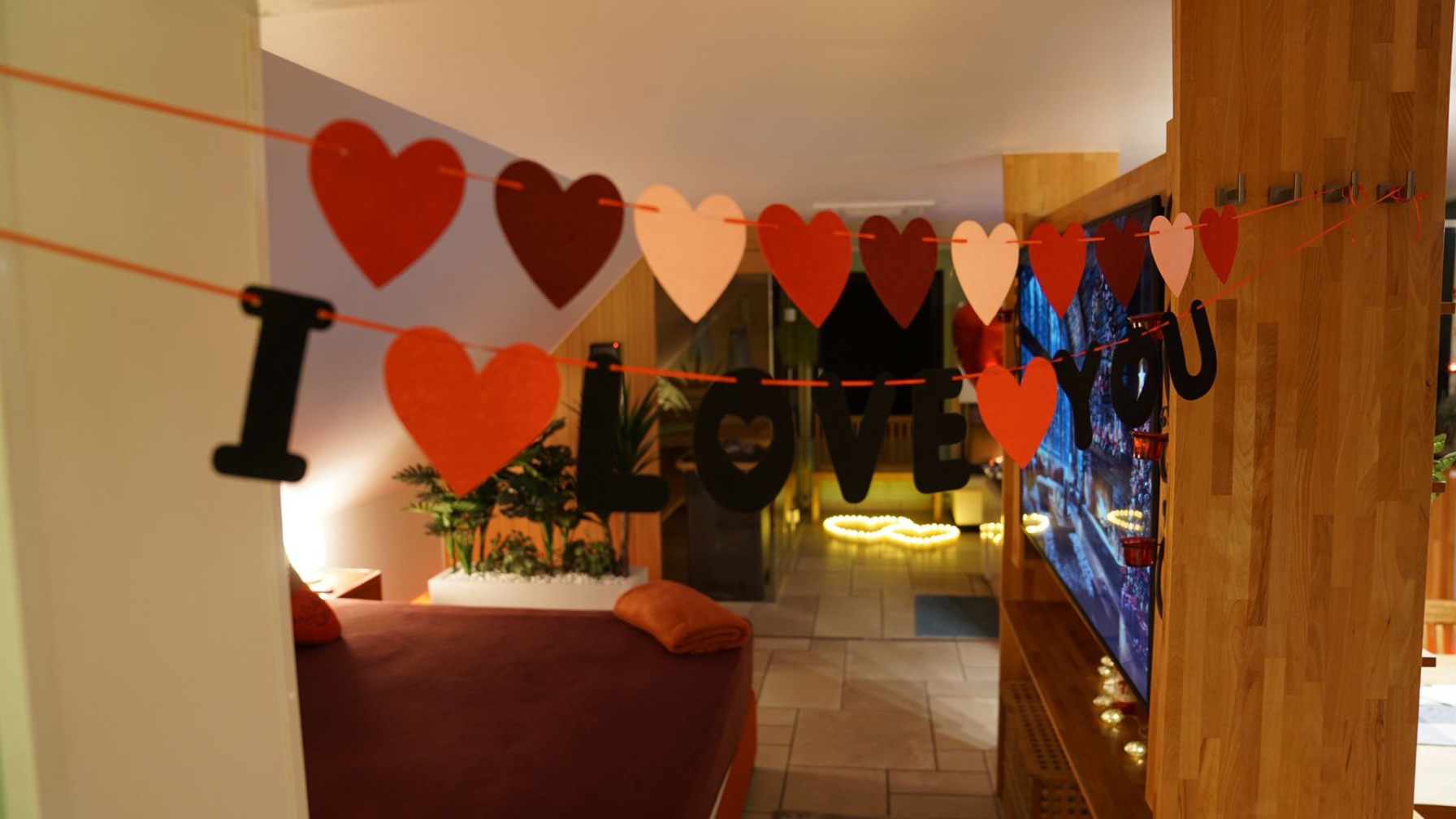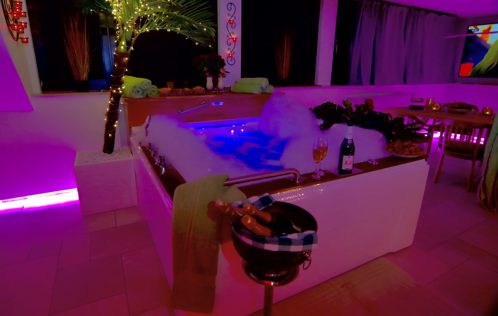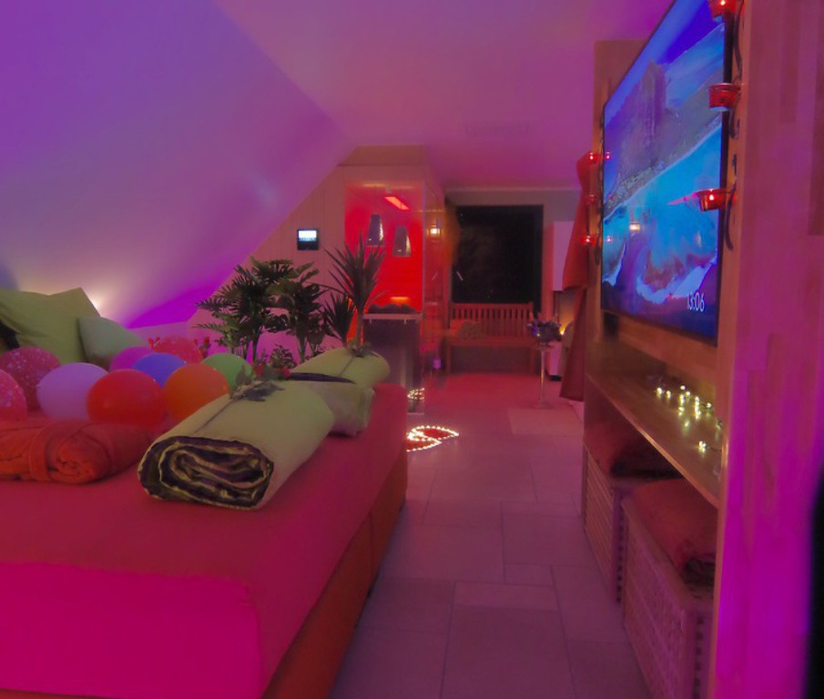 vom Whirlpool oder vom Bett aus einen romantischen Film schauen,